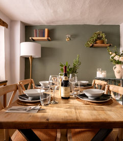 The bespoke dining table is laid up for a celebration with stone ware crockery and linen napkins, whether it be a milestone birthday or a family Sunday roast, we have ensured the kitchen is fully stocked with all the cooking utensils you will need. Help yourself to an aperitif from our drinks sideboard to kick off the holiday.